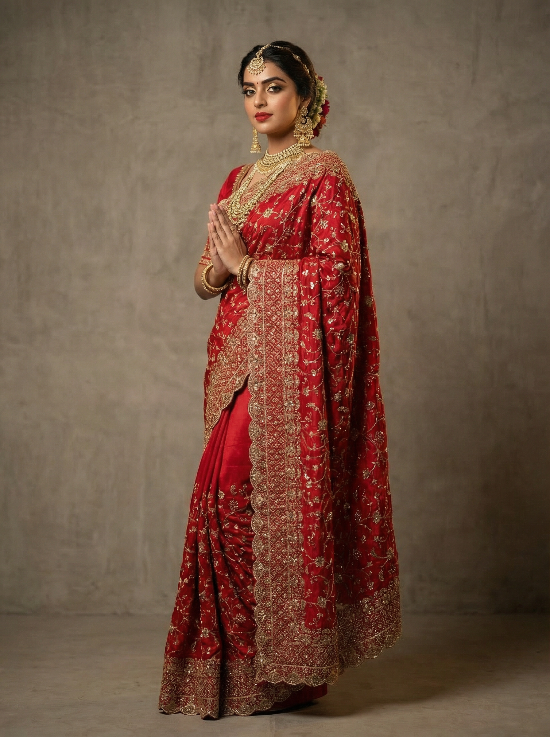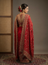 This crimson red georgette organza saree is adorned with rich embroidery and intricate detailing, creating a striking balance of grace and grandeur. Flowing yet structured, it is designed for bridal moments, wedding rituals, and celebrations that call for timeless elegance and presence.