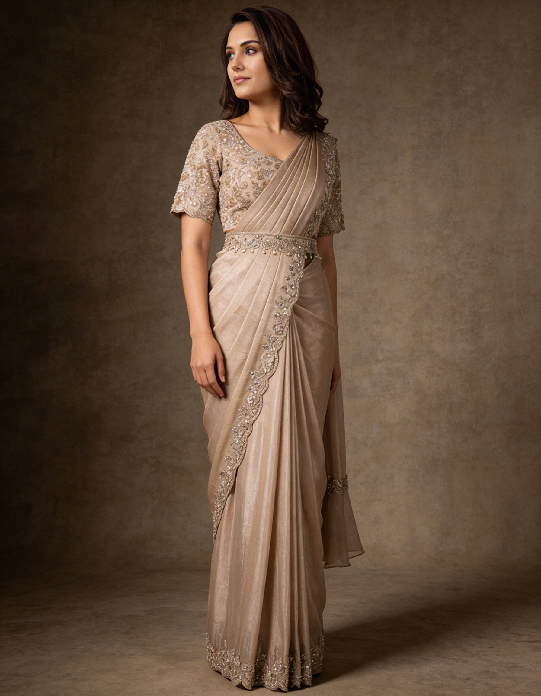 Elegant champagne gold two-tone glossy satin saree featuring pearl handwork and sequins embroidery. Comes with blouse and belt for a refined festive appeal.
