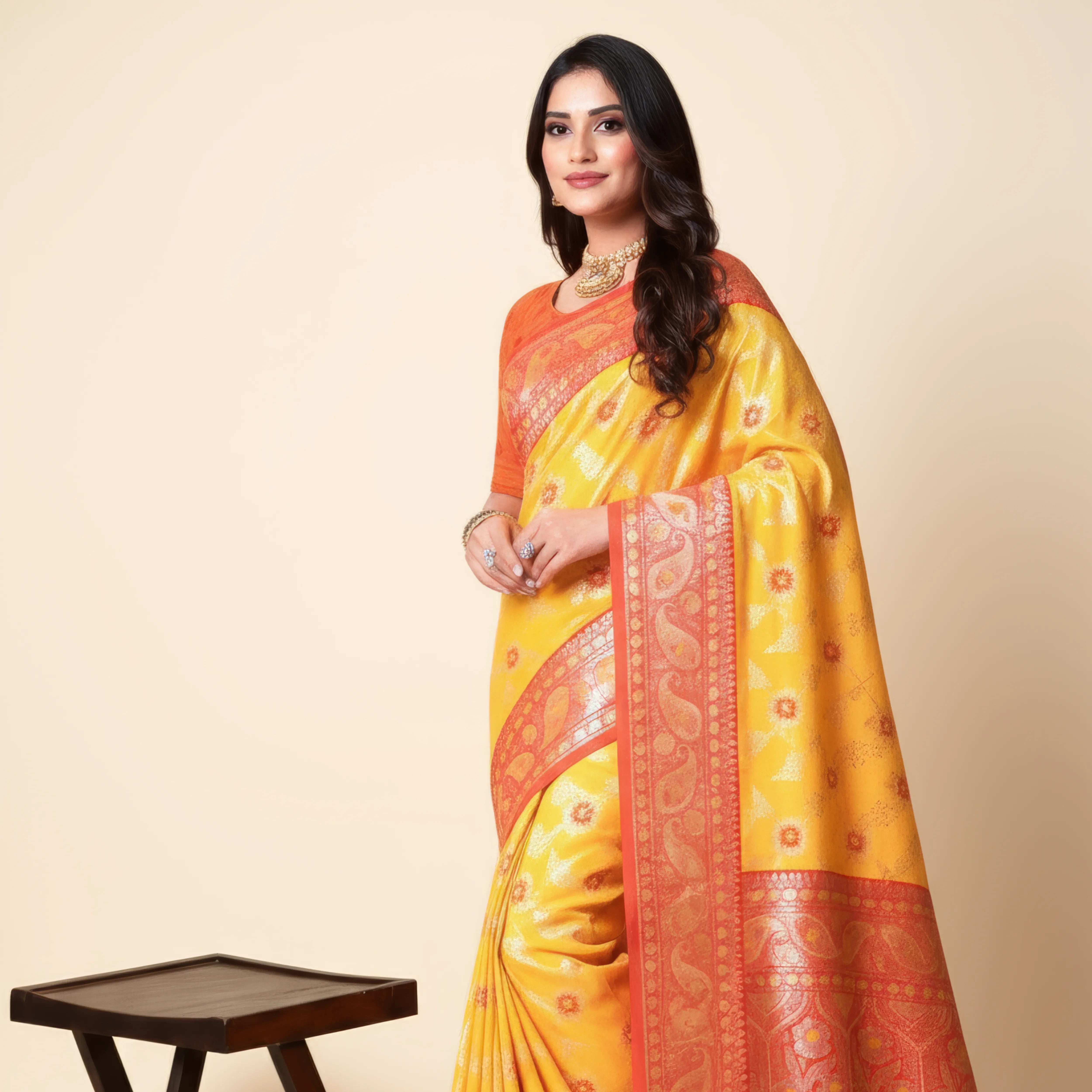 Vibrant yellow silk with a soft, lustrous finish, perfect for festive and bright occasions.