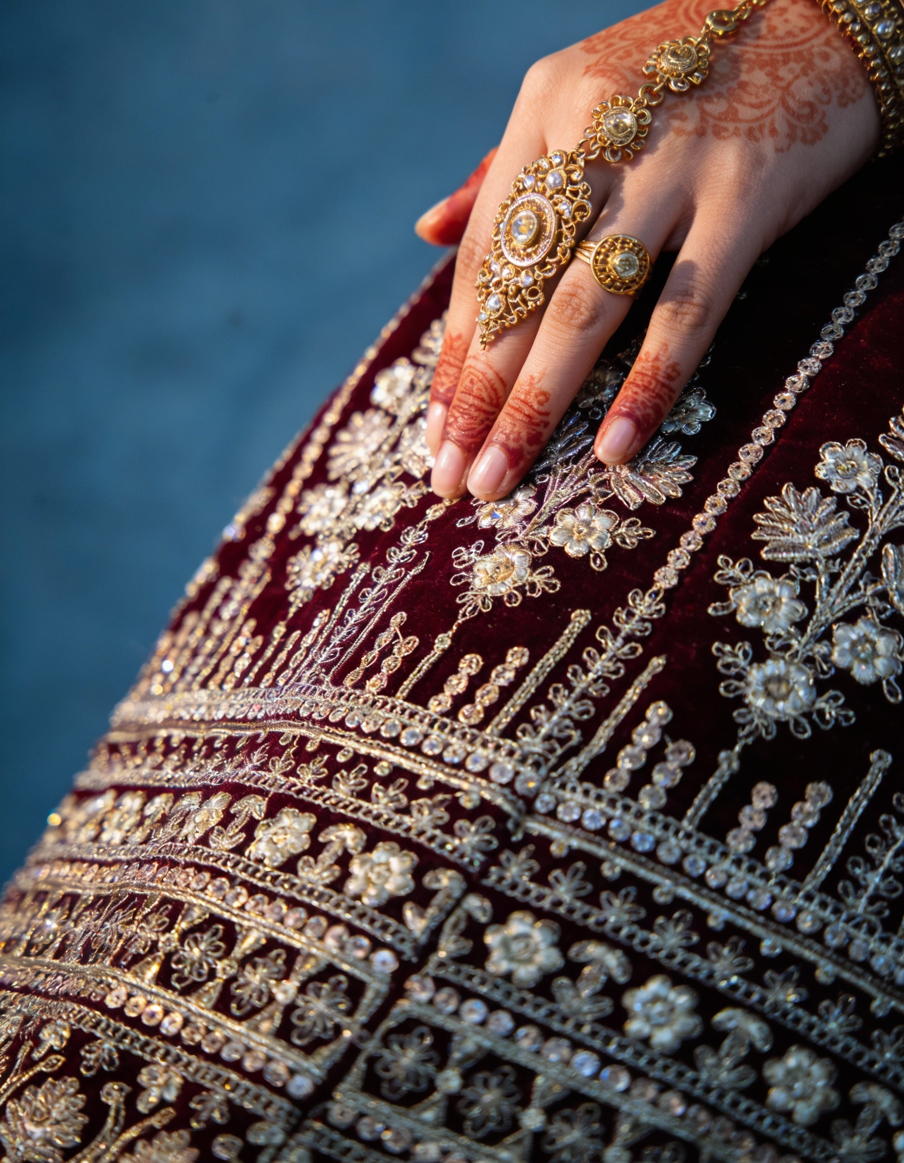 This maroon and antique gold velvet bridal lehenga is crafted with rich, opulent velvet and intricate gold embellishments that reflect timeless bridal grandeur. Designed with a semi-stitched silhouette, it offers a perfect balance of regal presence and custom-fit comfort for unforgettable wedding moments.