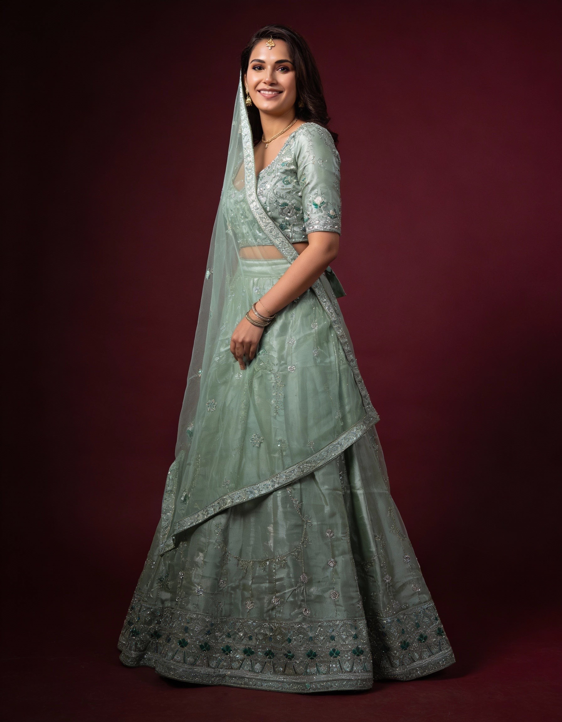 Sage Green Organza Lehenga (Semi-Stitched)