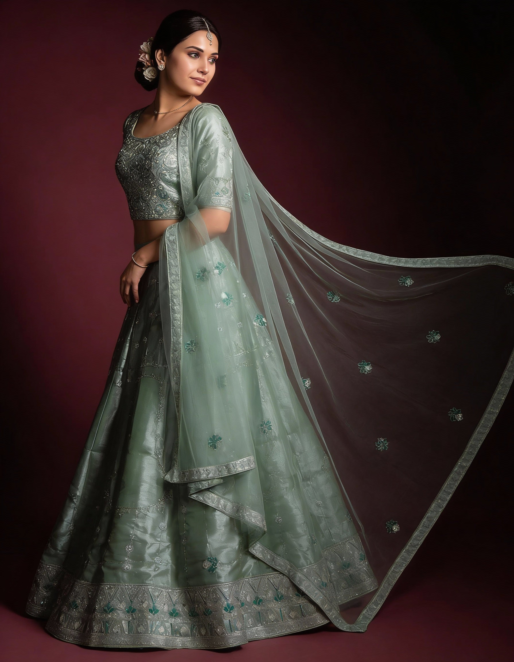 This sage green organza lehenga features a sheer, flowing silhouette enhanced with delicate embroidery and a soft, luminous finish. Designed in a semi-stitched style, it brings effortless elegance and modern grace to festive occasions and wedding celebrations.