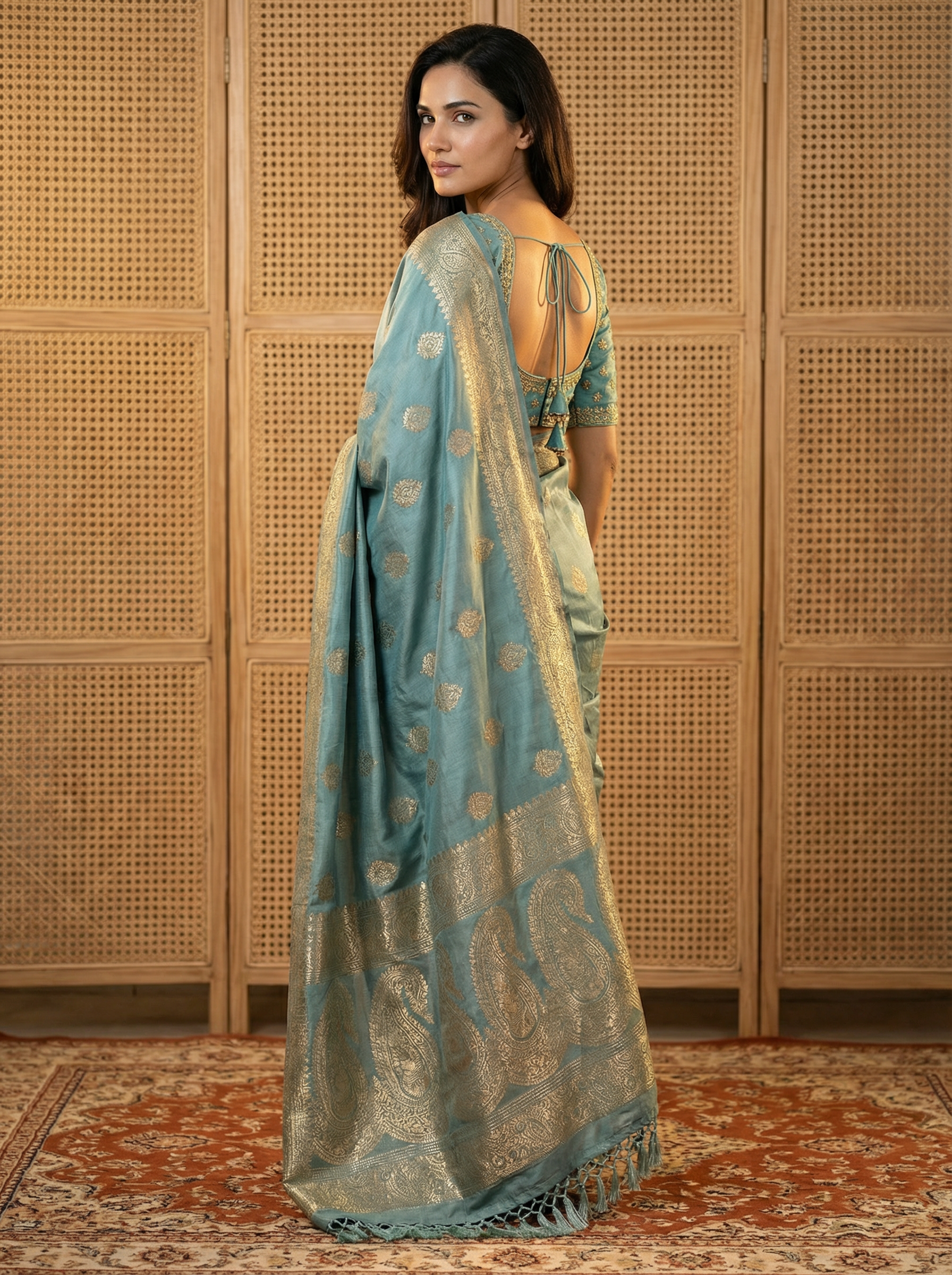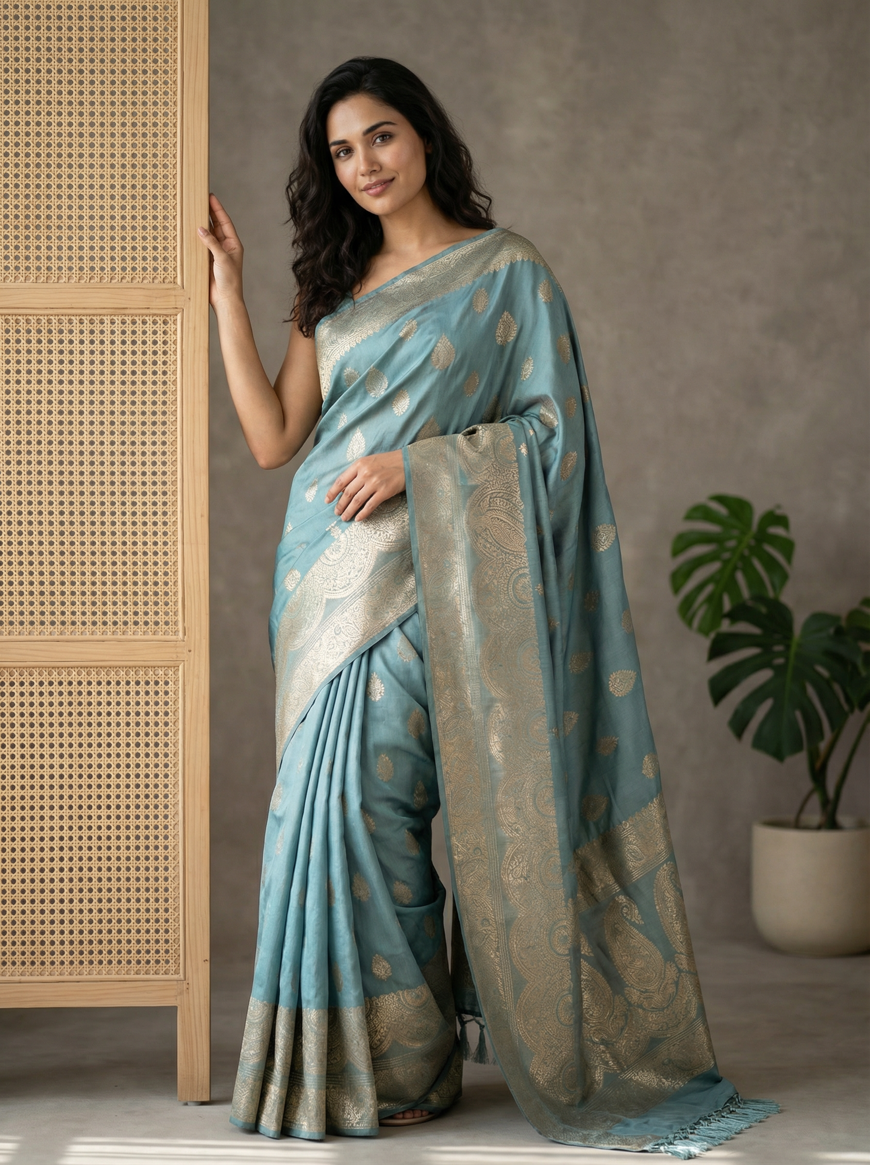 This silver-gold art silk saree features a smooth, elegant drape highlighted by subtle metallic motifs and a refined woven border. Gracefully balanced between contemporary charm and traditional elegance, it is ideal for festive occasions, formal gatherings, and timeless celebrations.