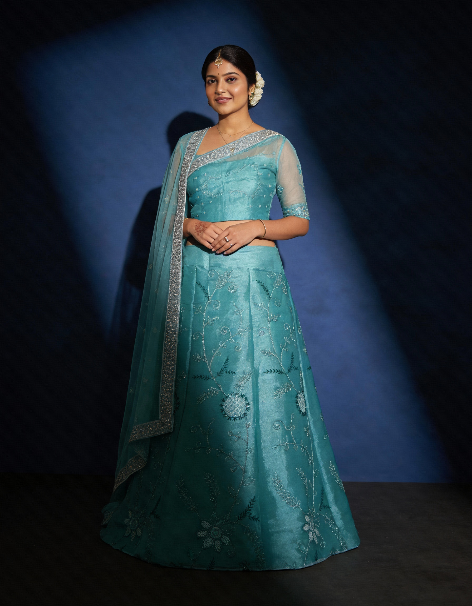 This teal blue organza lehenga features a sheer, structured drape highlighted with delicate embroidery and a subtle shimmer. Designed in a semi-stitched silhouette, it offers refined elegance and comfort, making it a perfect choice for festive occasions, receptions, and modern wedding celebrations.